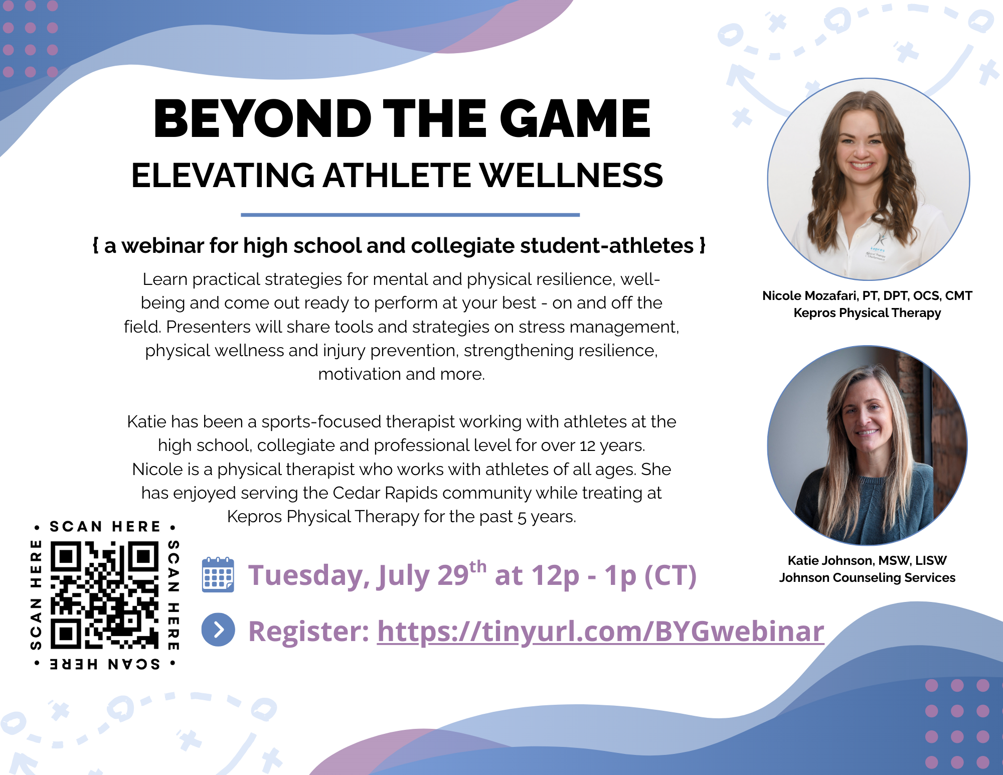 This webinar was held on Tuesday, July 29th from 12p - 1p (CT). Katie Johnson, MSW, LISW and Nicole Mozafari, PT, DPT, OCS, CMT presented an hour packed with information on mental and physical health and well-being strategies to help student-athletes perform their best on and off the field.